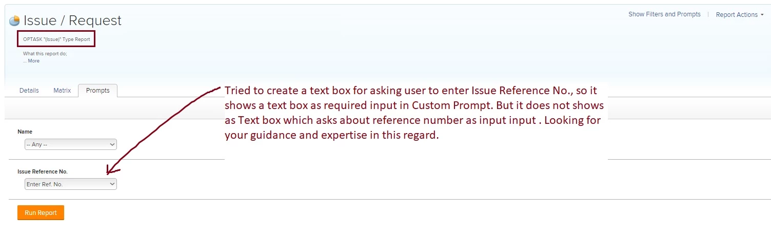 How to create a Text Box for Issue Reference Number in Report Prompt for "Issue Type Report"?