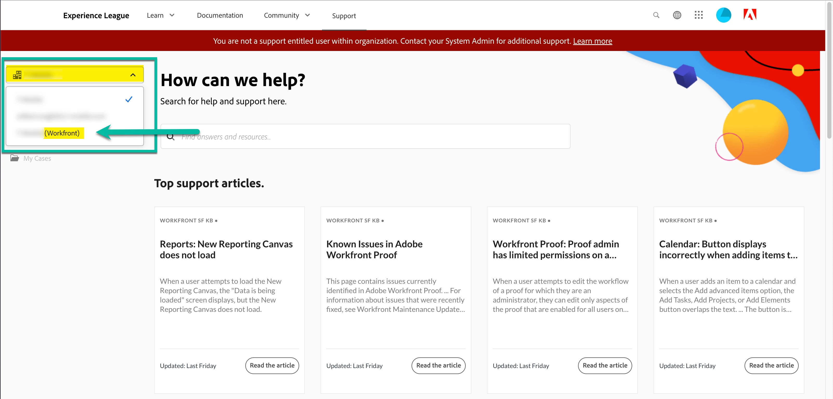 From there, you should have a dropdown menu in the top left corner where you can change the setting to yourcompany (Workfront). Switching that setting will grant you Support access.