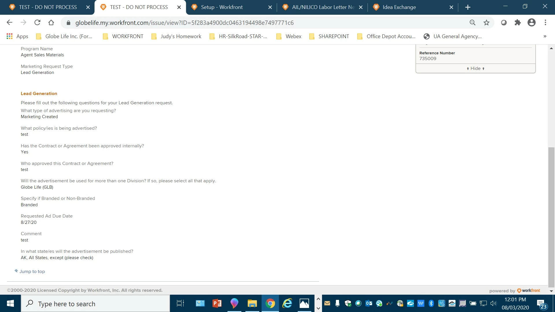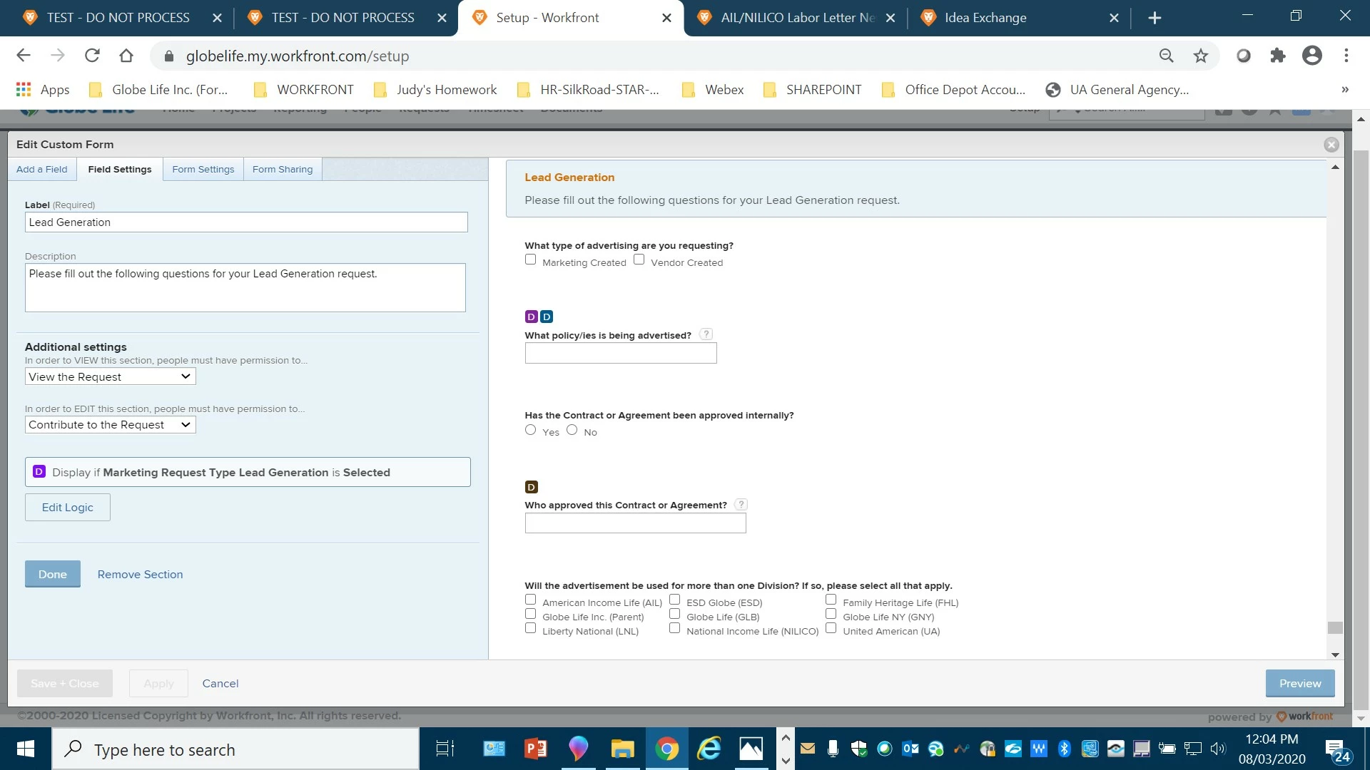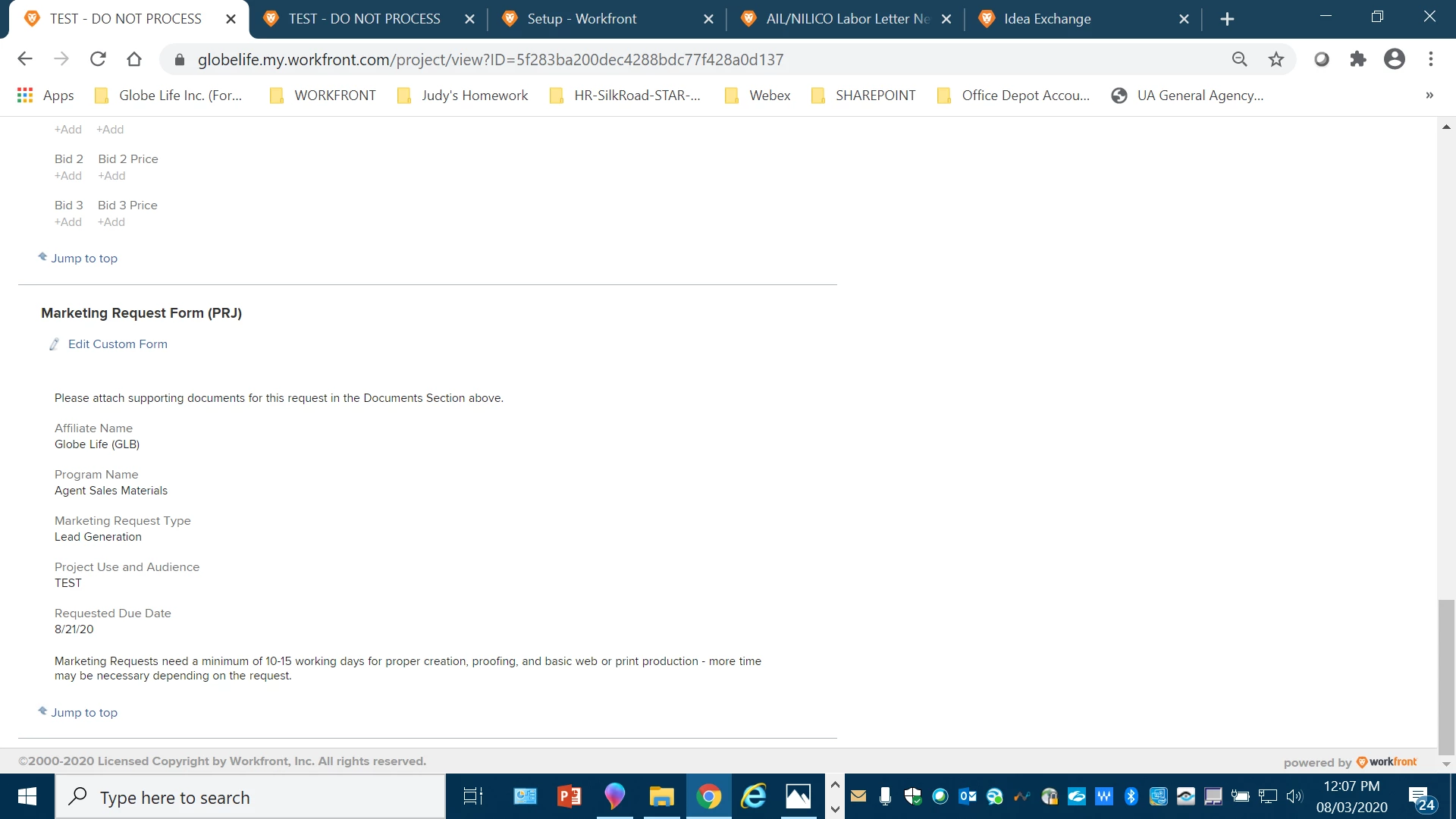 IMAGE 1 below shows therequest converted to the Project LEVEL without the Lead Generation form transferring over, while IMAGE 2 below shows the Lead Generation form filled in at the Marketing Request before it is converted to a project (works fine at the request level). The last two slides (out of order) shows the MARKETING REQUEST FORM found in the USER SET UP / CUSTOM FORM area in Workfront (back office).