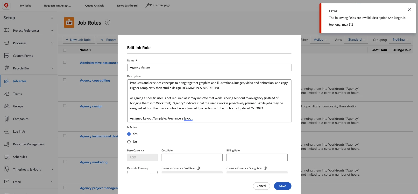 Description - Today I learned (TIL) that there is a character limit on the description field for a Job Role. I can live with the character limit, however when I first ran into it, Workfront didn't deliver a clear message describing that there was a limit.