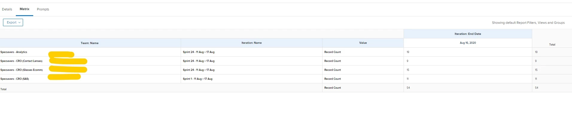I have checked the hours report, and doesn't have the options for team name, or iteration name, so it won't work on there.
