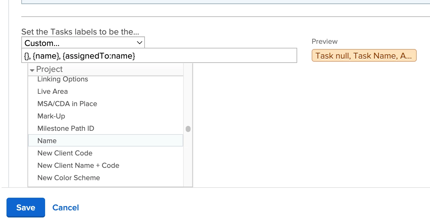 If you type in a left curly bracket {, you'll get a dropdown of possible fields you can add. In the screenshot I'm selecting project:name preceding task name and assignedTo:name