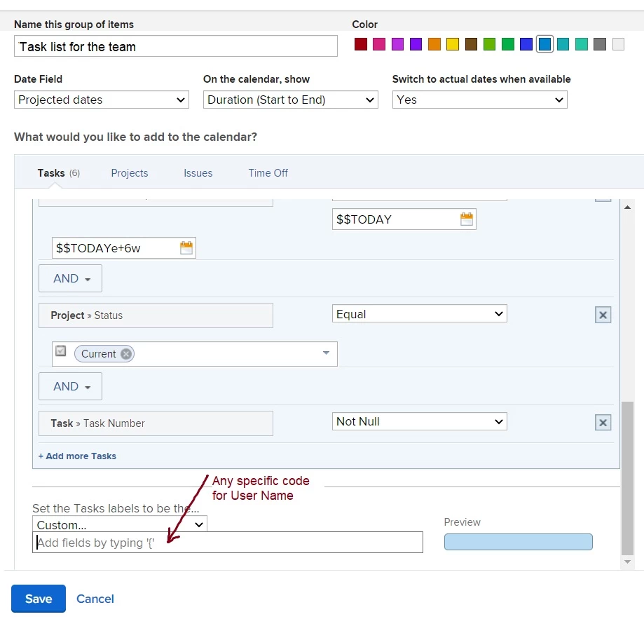 Is it possible to create a calendar User based for their tasks? Instead of task list it should show user name and project name. | Community