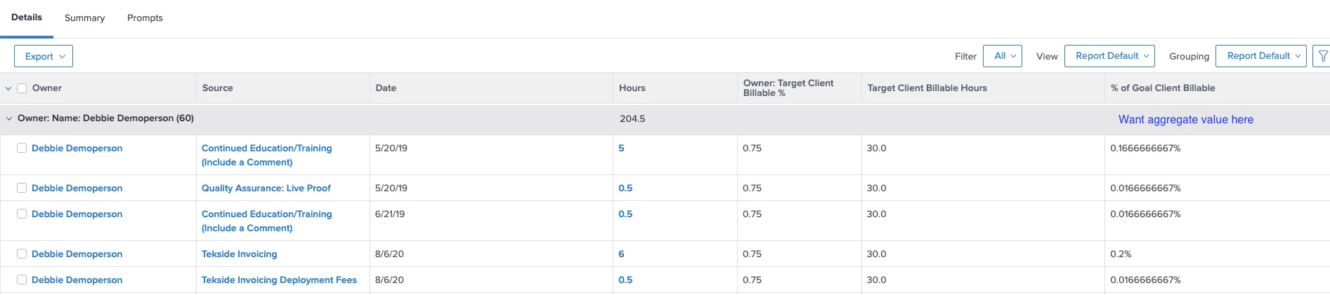 I want to aggregate this calculated custom column up to the grouping level so I can see a value by the hour Owner grouping. See attached screenshot of what I have right now (no aggregate)