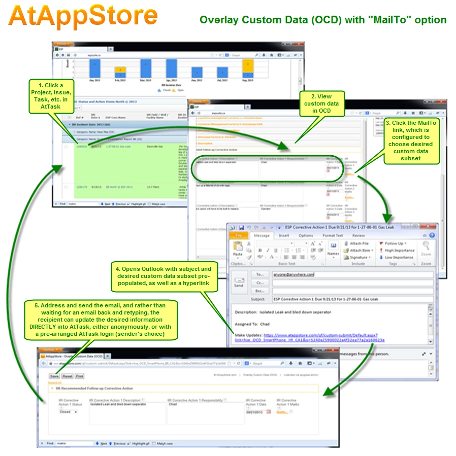 ">Overlay Custom Data solution includes the ability to automatically send only certain custom data via a link in an email, which the recipient can then click and update directly in Workfront. This saves a number of email steps, and is particularly well suited for feedback questionnaires. I'm attaching a diagram to illustrate how it works.