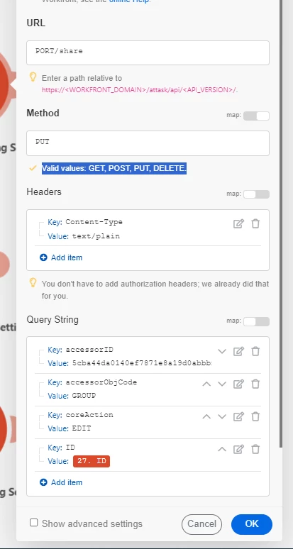 Last step is a Custom API call module configured as below.