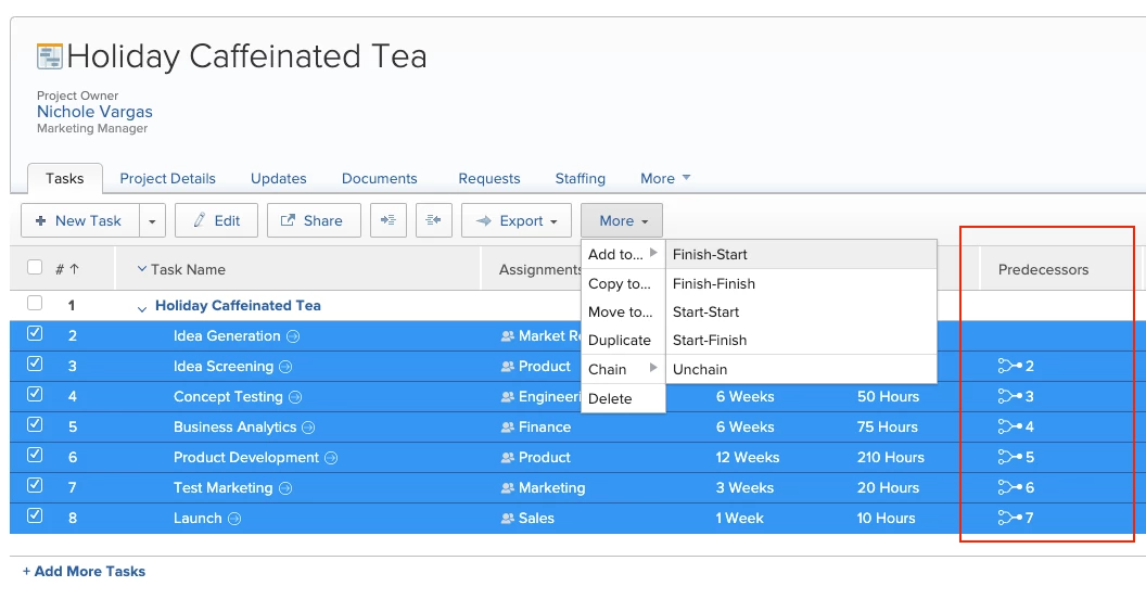 Example #1: The Product team is developing a new line of caffeinated tea for the holiday season. The following tasks have been added to the project timeline: