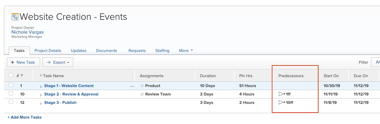 By adding this predecessor relationship, the project timeline can automatically adjust so that review and approval (Stage 2) cannot be finished until content (Stage 1) has been done. Likewise, in order to publish the website (Stage 3), Stage 2 must be marked as complete.