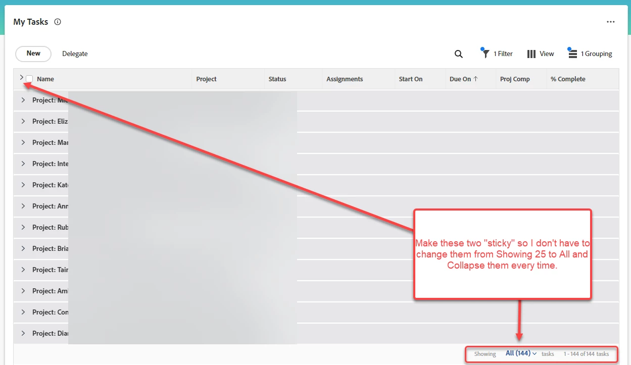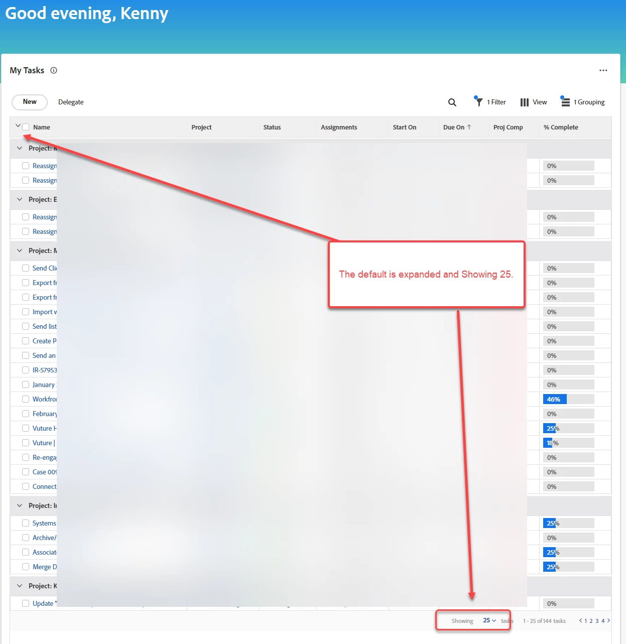 I change "Showing" from 25 to All and collapse all the projects so I only see the project names. This is better visually (not as overwhelming when I don't see all the tasks under the project) and helps me prioritize at a glance and recognize new projects that I might have a one-and-done task instead of multiple tasks.