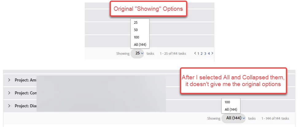 Also, after changing "Showing" All, it doesn't give me the original options again, i.e., 25, 50, 100, All.