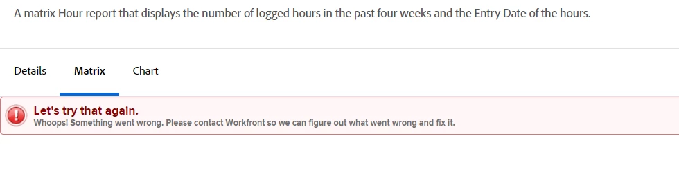 The Matrix view of timesheet reporting I've set up won't display. Is this a bug or have I done something wrong? Chart and Details display absolutely fine.