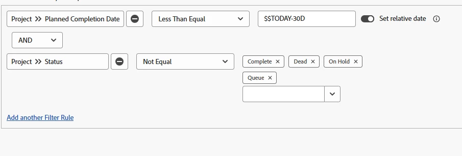 What is the expression to be used in filters to fetch projects that are overdue past 30days from planned completion date.