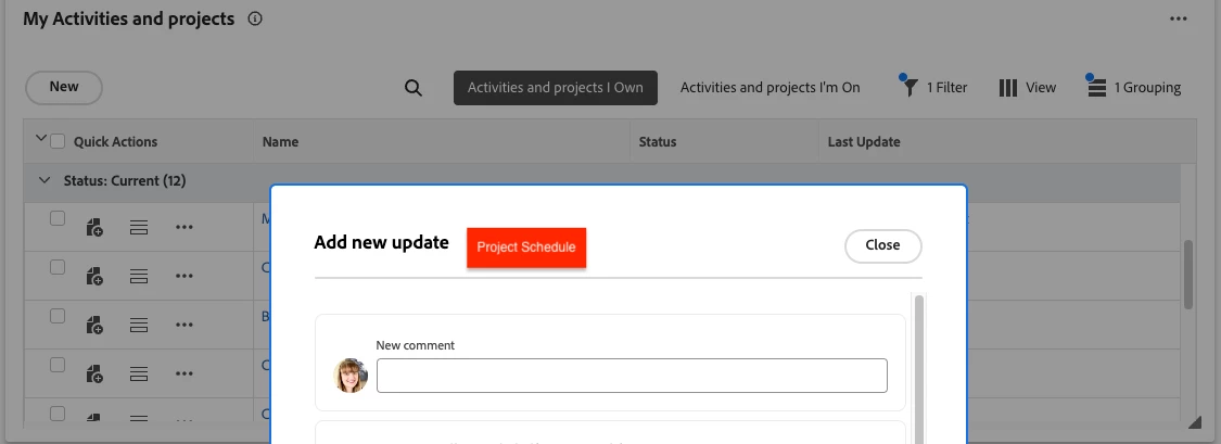 Description - View Project Schedule when Adding an Update from Quick Actions