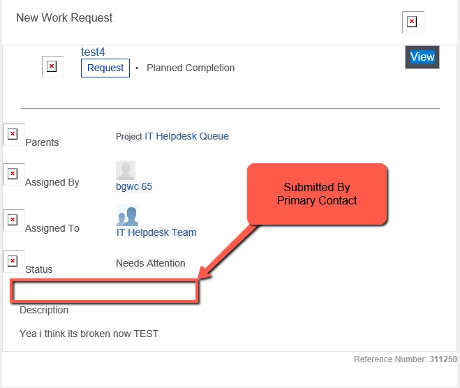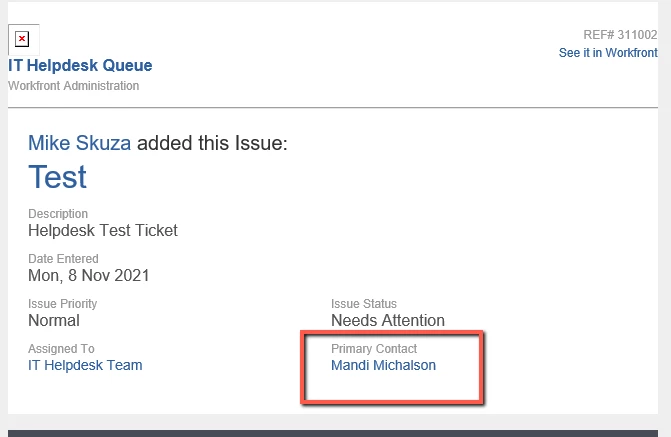 We would like the field "Primary Contact" to be added to the New Work Request notification. In the example, it is already part of the Issue Added notification. This is used for our helpesk ticketing system and has been requested by the IT Manager.
