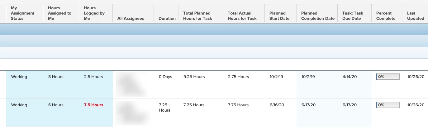 This report is on a dashboard for each worker and lists any task they are assigned to. It shows their individual part of the assignment (blue columns), plus the task name and project name (not shown, confidential). Yes, most of our tasks are multi-assigned, but this report gives insight at the individual assignee level.