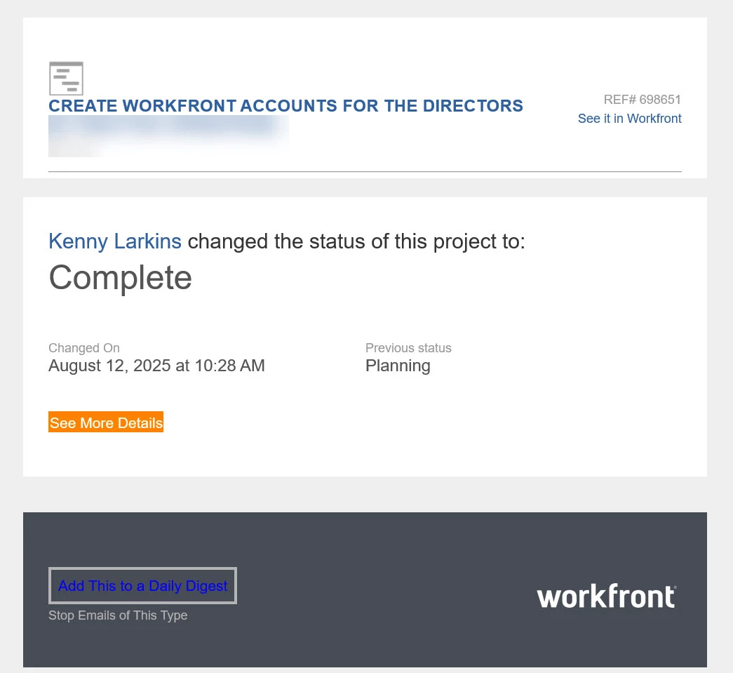 Description - In my role, I often create projects, leave them in Planning and then mark as Complete just so there's a record, but I also, do the normal project workflow of Planning, Current, and Complete. It would be helpful if there was an option to prevent email notifications from being sent on a specific project, i.e., the ones that go from Planning to Complete.