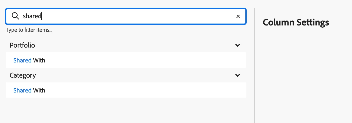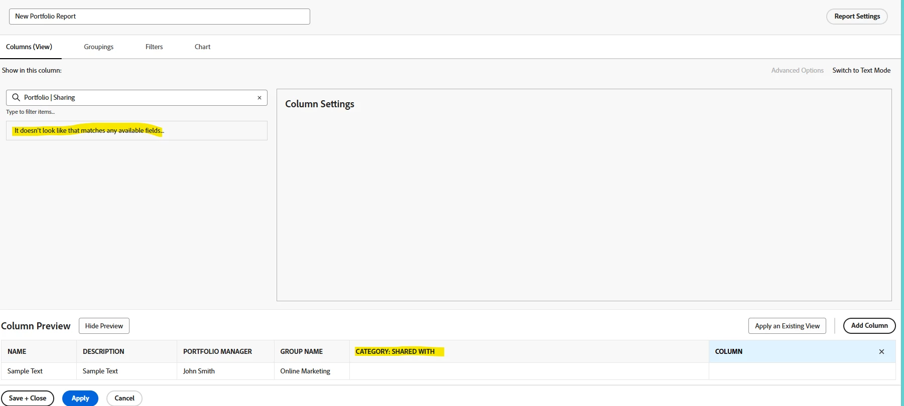 I wanted to check the permissions of all my portfolios but there is no native field for such column. The one field which is giving me some data is - "Category - shared with".