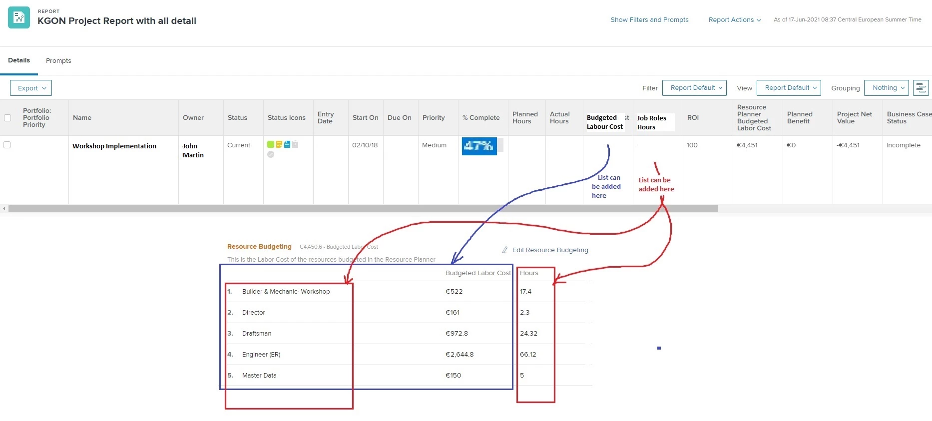 I have created a project report. Looking for possibility to add column to list the job role title with budgeted cost and one column with budgeted hours. Is there any additional criteria to add as column.