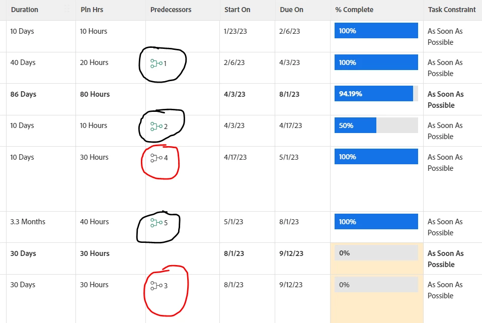 Green means the predecessor task is complete and black means the predecessor task is not complete yet.