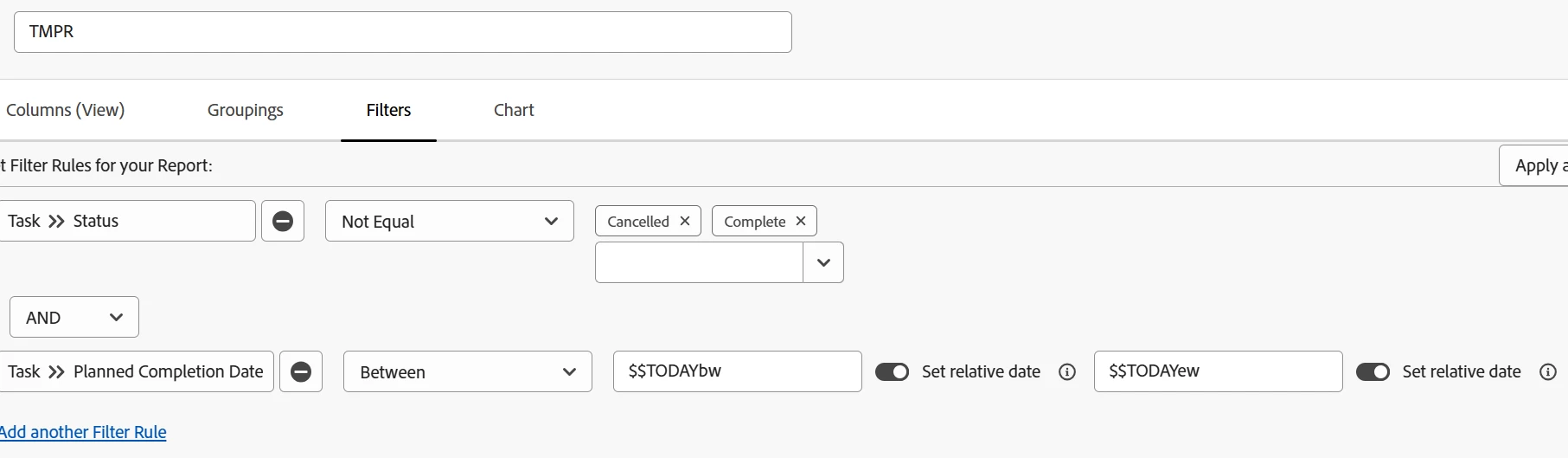 I tried variations of the text mode filter, but I still get projects on the report when the tasks are in CPL status. So I think the plannedCompletionDate filter works, I just need to filter out the task status of CPL (I don't want to see the project on the report if the tasks have been completed even if the planned completion date is due this week).