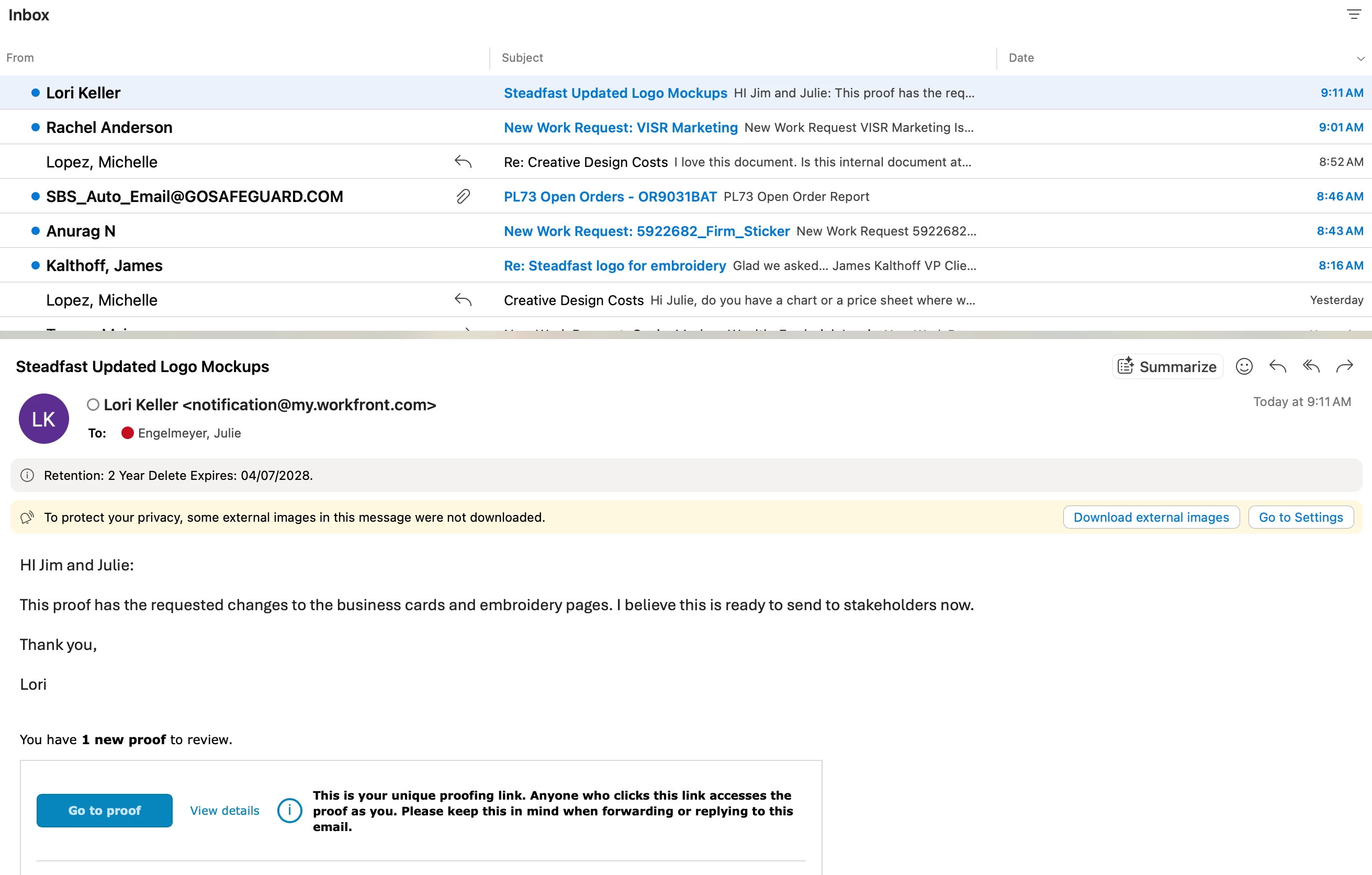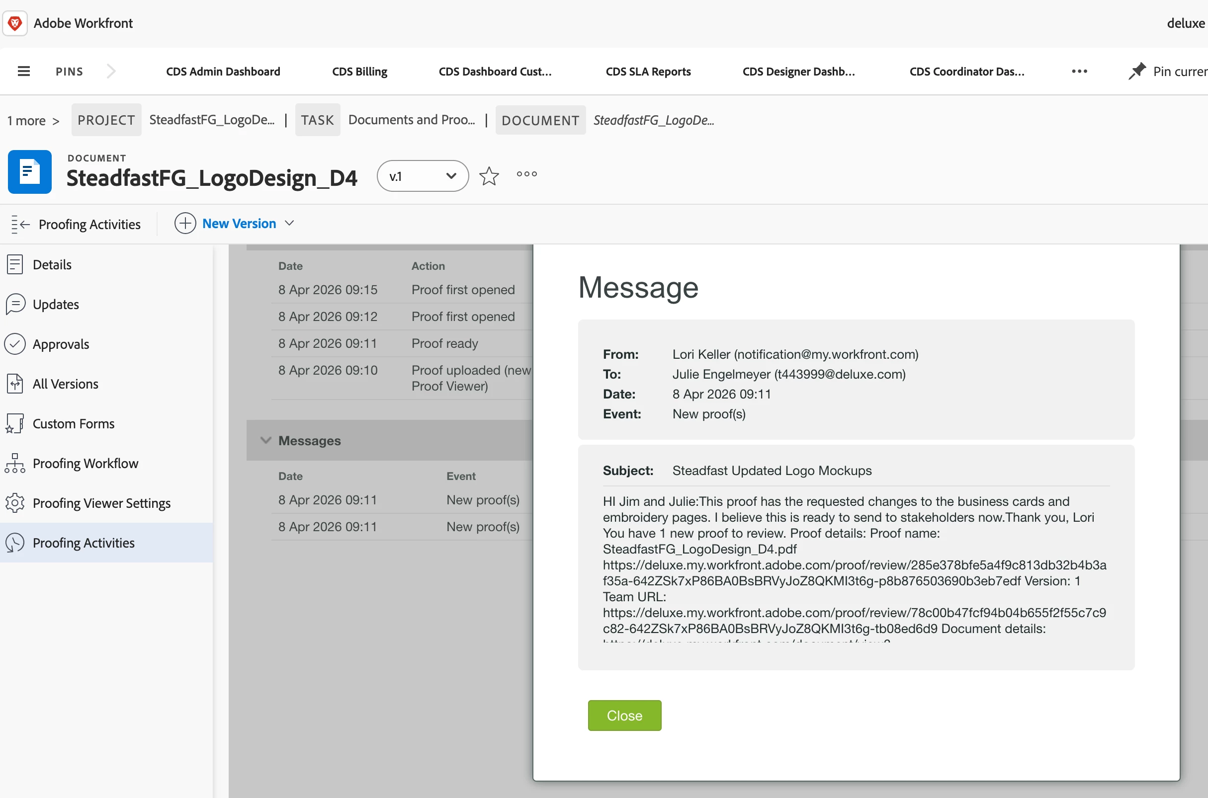 It took us like 5 clicks to find the message back in the document in Workfront….
