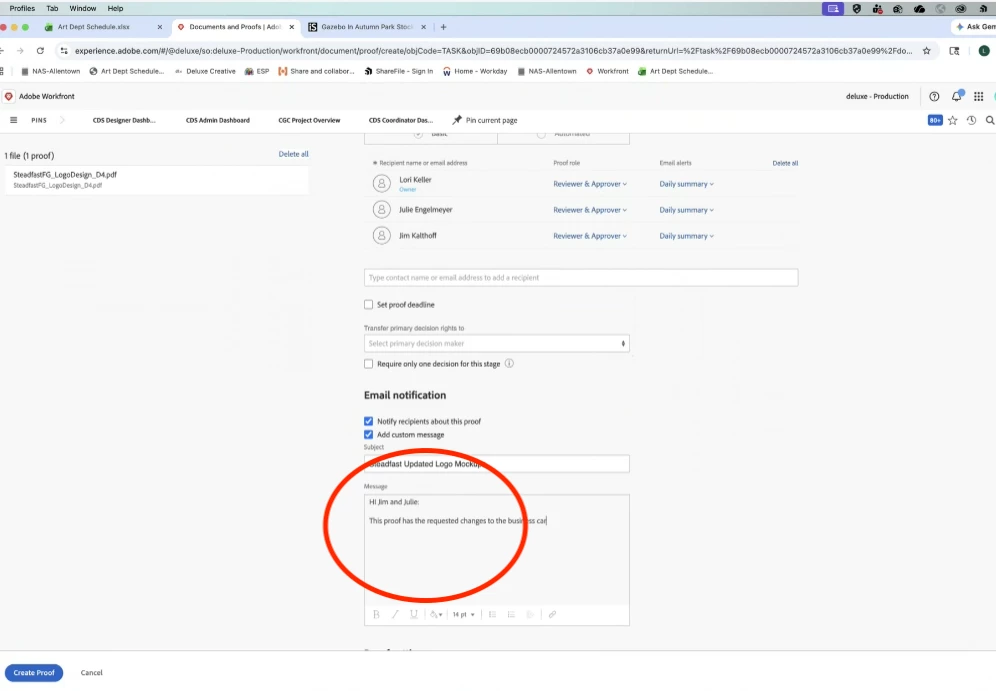 We use this as our screen to send proofs to team members and discovered this messages box, which is great because we always want to send a note with the proof.