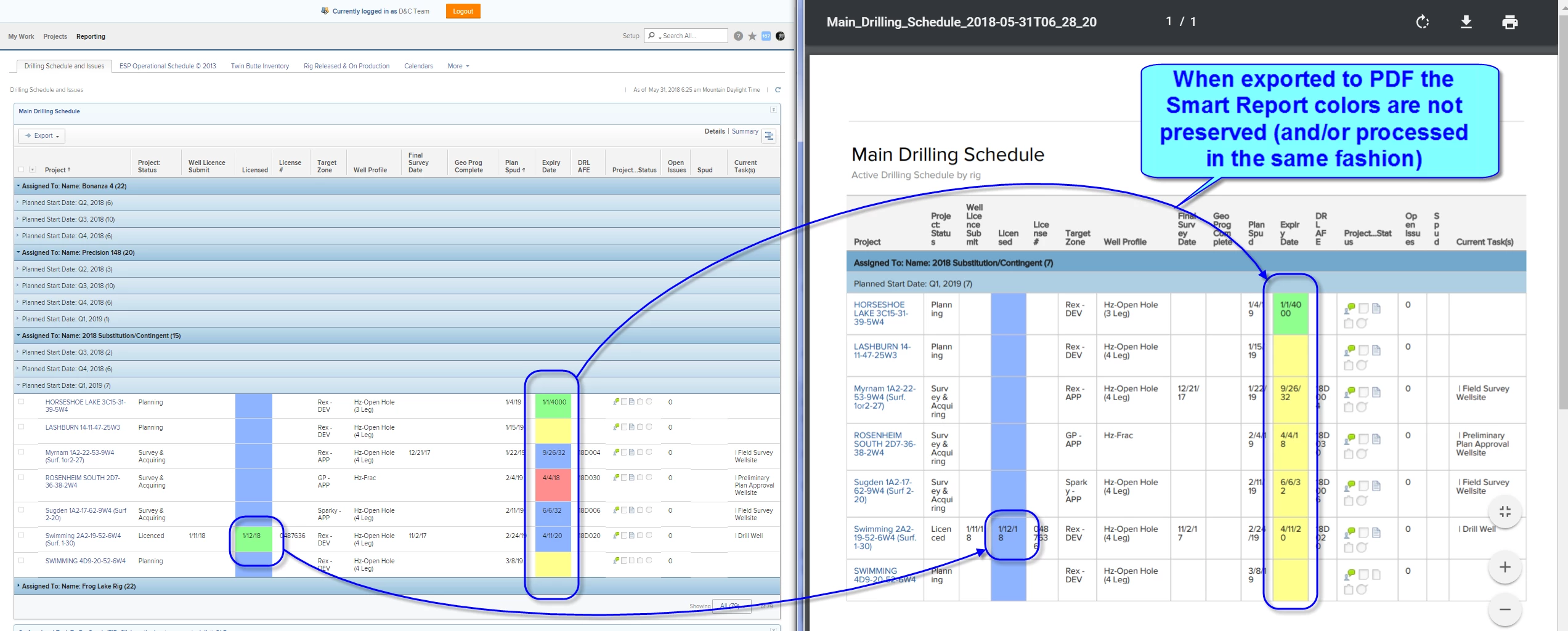 I have an oldie-but-a-goodie report that has some special color formatting on it to highlight dates of interest (green good, red bad, yellow coming up, blue can wait, etc.). However, one of my clients pointed out to me that when the information is exported to pdf, the colors are "off", as below. I'm tempted to rebuild it and see if that "clears it", but with hundreds of such reports, would rather find a less intensive workaround.