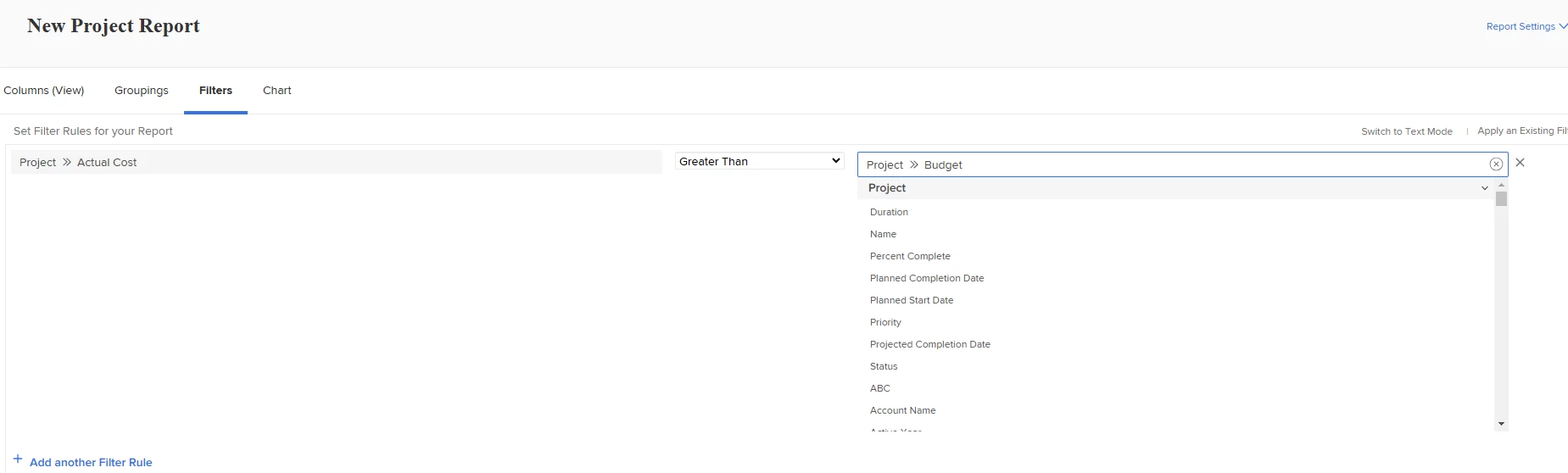 I am trying to pull a report that pulls specific criteria including if one currency field is greater than another. What would be the best way to do this? For example, in my screenshot, I know we can't put the field name in the box unless you're in text mode, but I'm trying to show what we are attempting to pull. Does anyone know the best way to write this out in text mode?