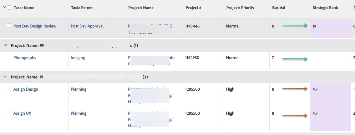 - I do not want to see the 4.7 rank that has the red arrow pointing to it. (The tasks/assignments should still show on the report, but the Strategic Rank cell should be blank.)