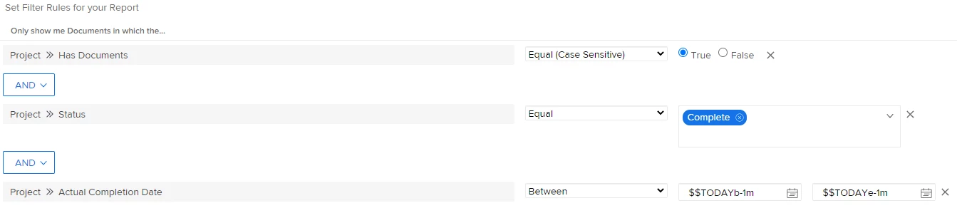 We are looking for a way to build a report that shows completed projects that has no document inside a specific folder. This is our current of folder settings inside document page of project: