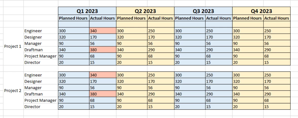 Report type under project Job role vs Planned Hours and Actual Hours per quarter