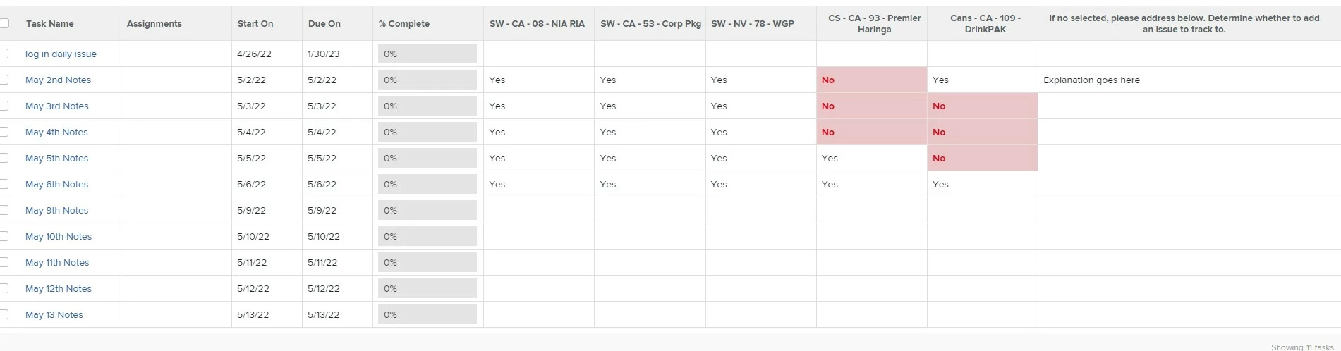 Is it possible for me to create a report to show me information across several custom fields that all have a yes/no possible response? See screenshot - I created a Task Report, where for 5 locations we can answer yes/no for each day... I want to somehow aggregate that yes/no data for an exception report - showing only the no's, or showing a trending of no's across a period of time. Eventually, I would like to show this trend across different projects (for that, I think I can just modify the filter to add in those other projects). Any ideas for how to do this, if possible? Thank you!