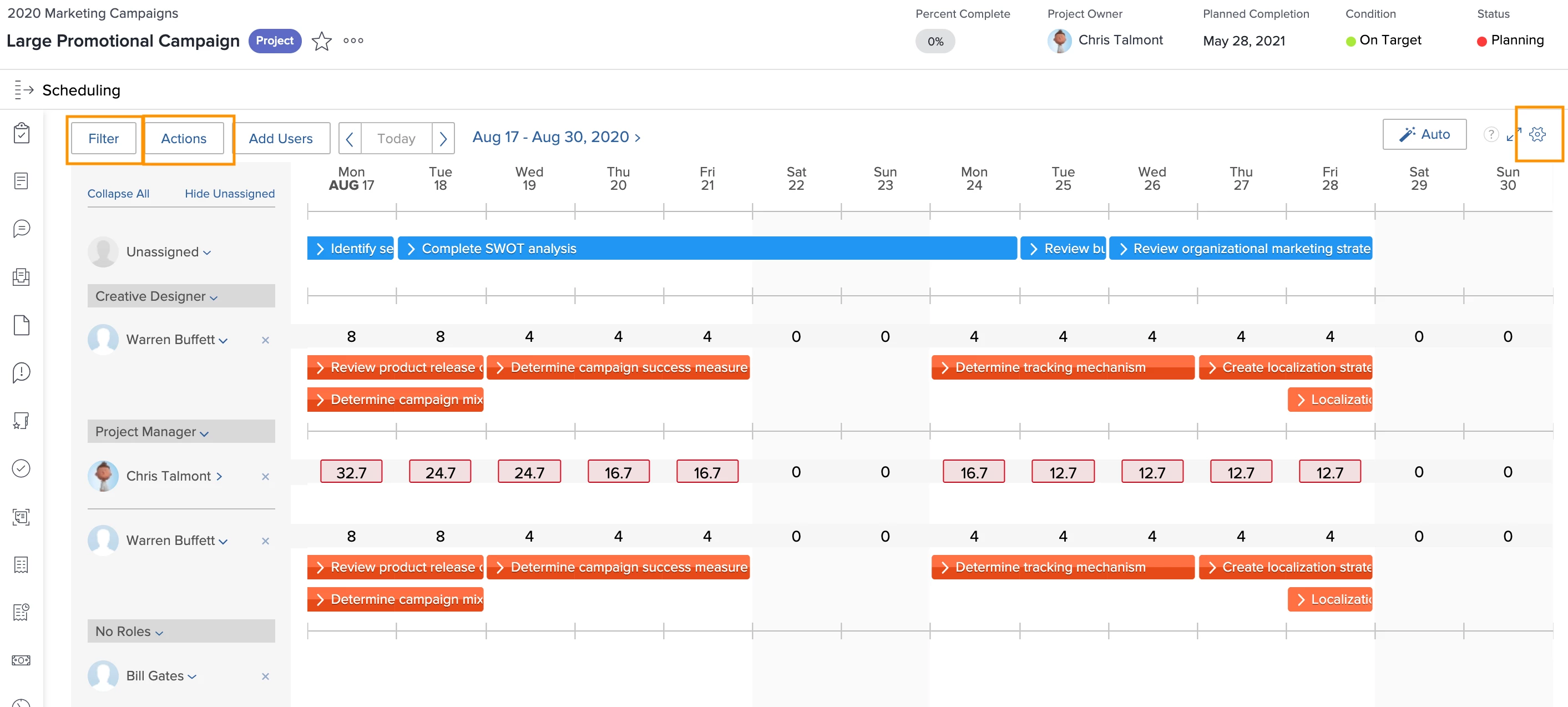 • The Global Scheduler allows for making bulk assignments when several work items need to be assigned to a single user at the same time. Unassigned work appears at the top and can be manually dragged to applicable resources with that role or assigned in bulk using the Actions feature. In some organizations, this may involve collaboration between project owners and resource managers to ensure the proper authorization and assignment of resources.