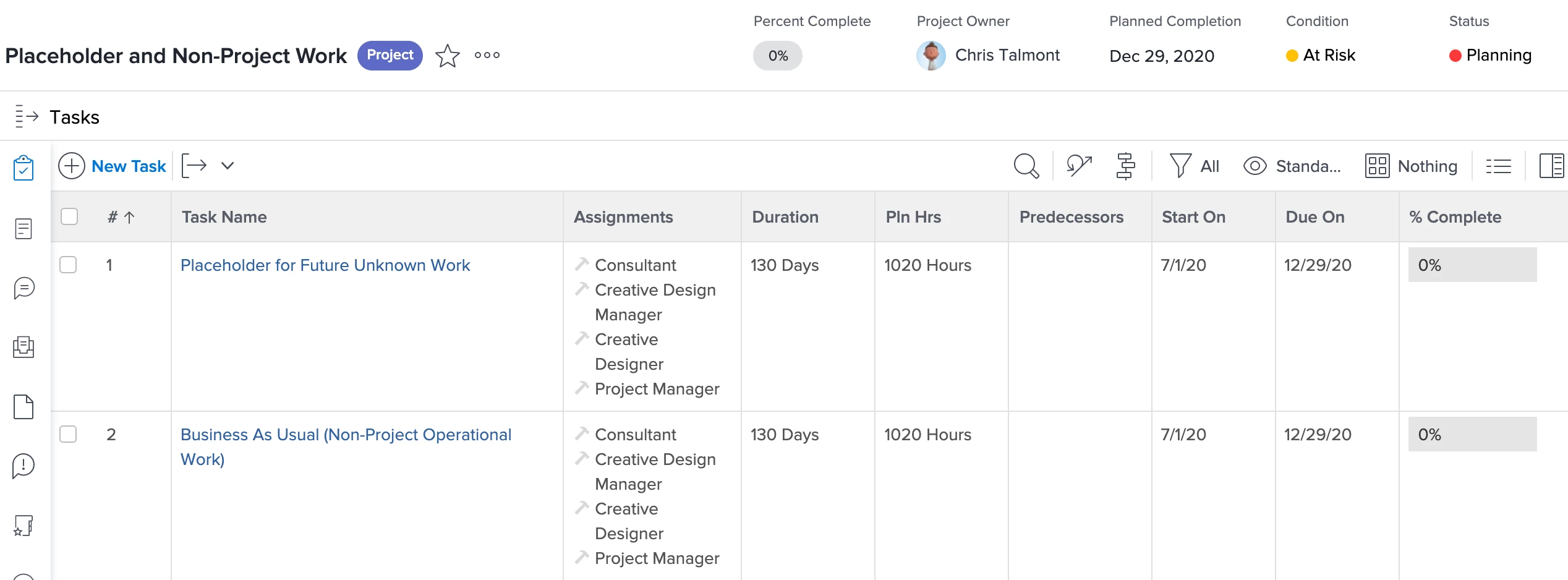 If a users’ non-project work will fluctuate over time, create a project to represent this non-project work. Similar to the technique for Documenting Unknown Project Work, add a task for each time unit (i.e. quarter, month, or week) and assign a user and add estimated planned hours to each task.