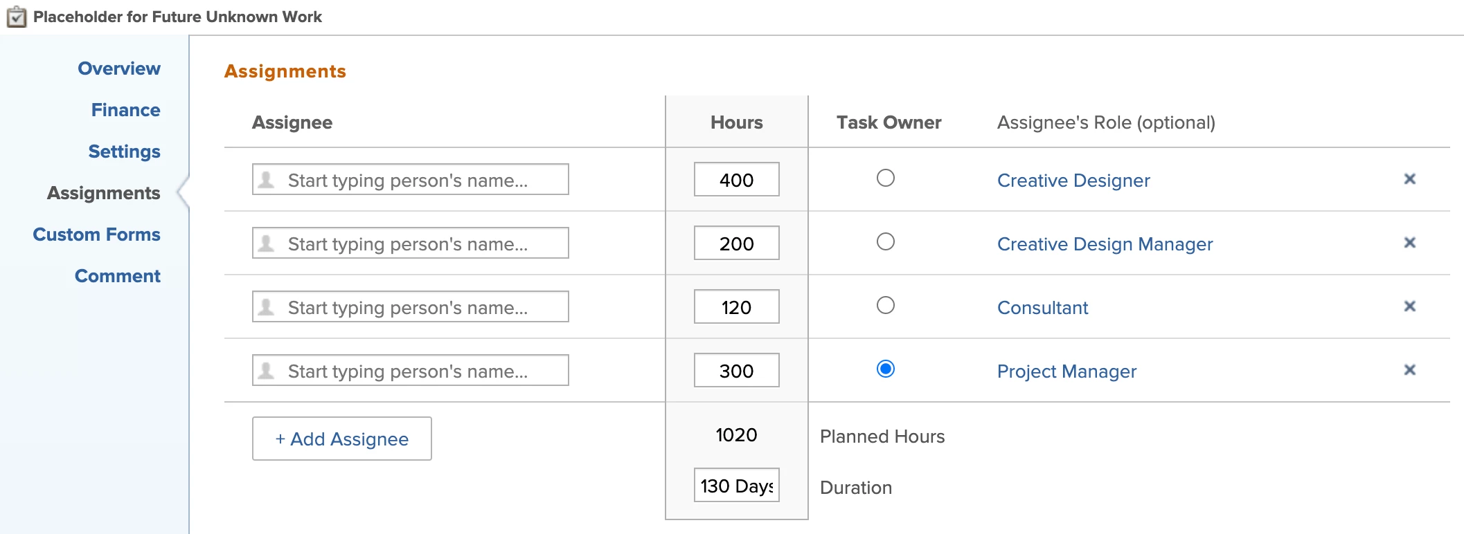 Assignments: Each task should be assigned the Job Roles or Users that will be contributing their effort to the completion of the work.