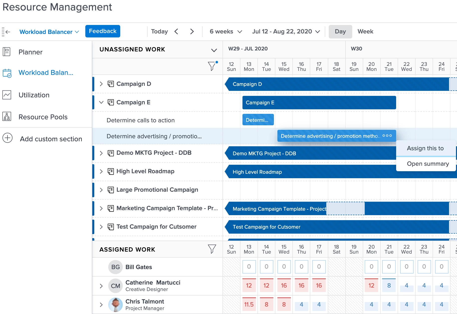 • In the Workload Balancer, unassigned work appears at the top and can be assigned to applicable resources with that role by clicking the three dots on the right side of a work item.