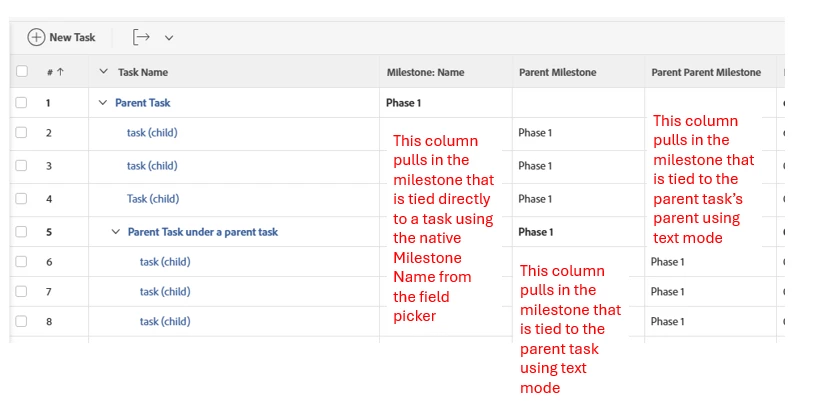 Additionally, something I've done previously was to add a custom form to tasks that had a calculated field for parent task milestone on it. This way it would just capture on the form what the milestone name was and then that can be pulled into reporting and views natively.