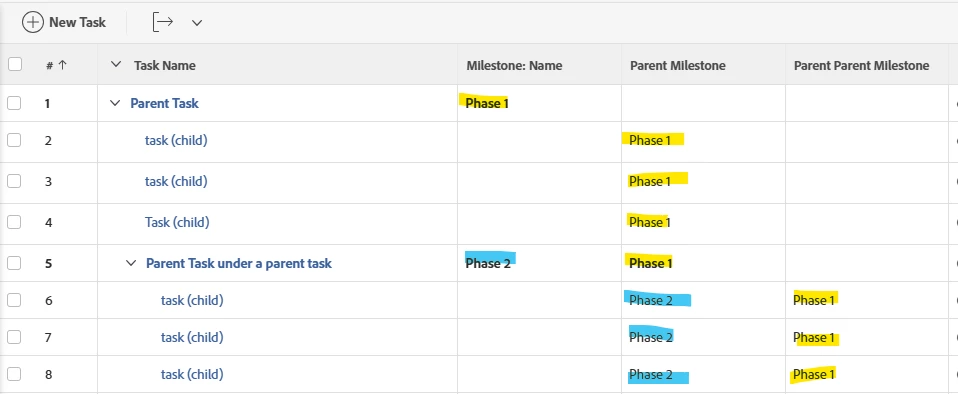 This will have to be a series depending on how deep you go on your parent task structure. Also, this will combine them all - so if you have a task that has a milestone and then also it lives under a parent task that has a milestone it will include both.