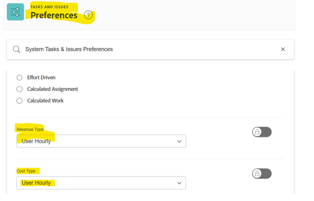 Option at the Project Level under Project Details for the Task and Issues Revenue and Cost Type.