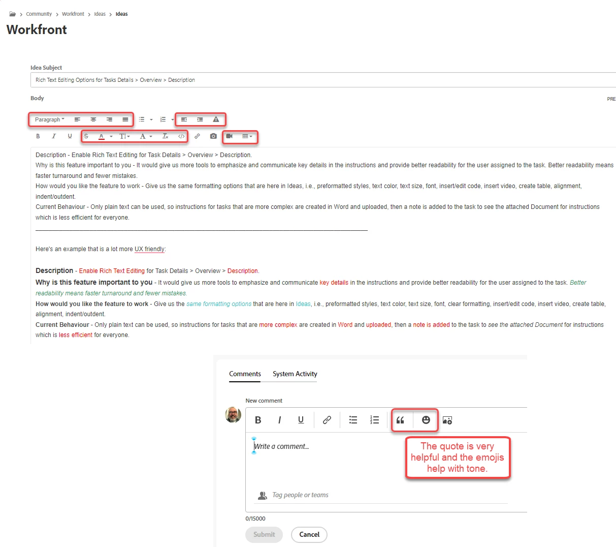 How would you like the feature to work - Give us the same formatting options that are here in Ideas, i.e., preformatted styles, text color, text size, font, clear formatting, insert/edit code, insert video, create table, alignment, indent/outdent.