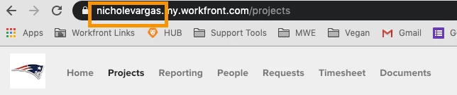 To access this test environment, system administrators can click into Setup > System > Preferences > Preview Sandbox. For all other users, simply navigate to https://domain.preview.workfront.com and you should be prompted with a login screen. If you are unsure of what your domain is, look at your Workfront URL—the text prior to .my.workfront.com is your domain. In the screenshot below, the domain is nicholevargas.