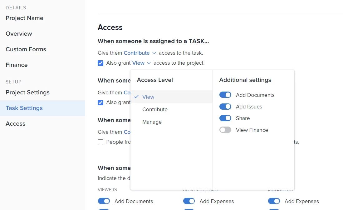 (1) You can configure what level of access a user is given to a project when they are assigned to a task or issue. This is done via the project settings. Here you can prevent users from obtaining view access to the project when being assigned to a work object. Note that this doesn't prevent people from inheriting view access from being tagged into updates though.