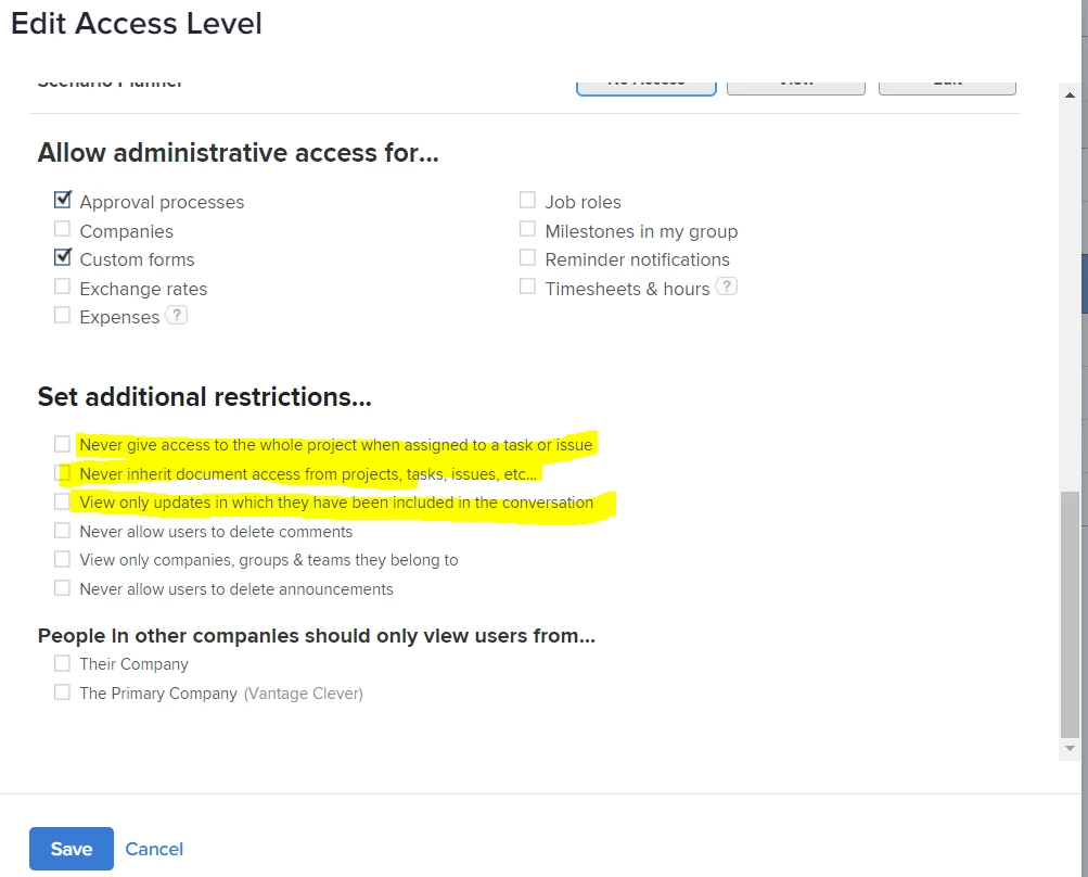 2) You can prevent users from inheriting access to projects / documents when they are assigned to work objects, and you can ensure that users are only able to see updates in the system when they have been tagged into the conversation. This is done via the access level settings. Please note that this is a global setting which will affect all users on that access level across all work objects in the system.