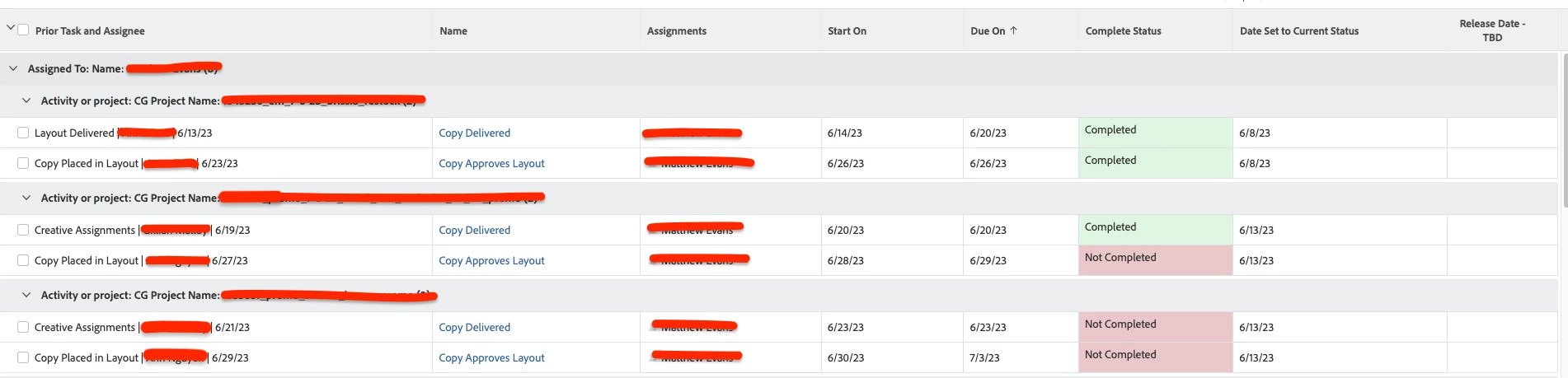 The problem I am running into is I need to be able to pull in a specific designer task that pulls in the date and assignee for when art work is due to release into a report column so the copywriters know when assets are due to release.