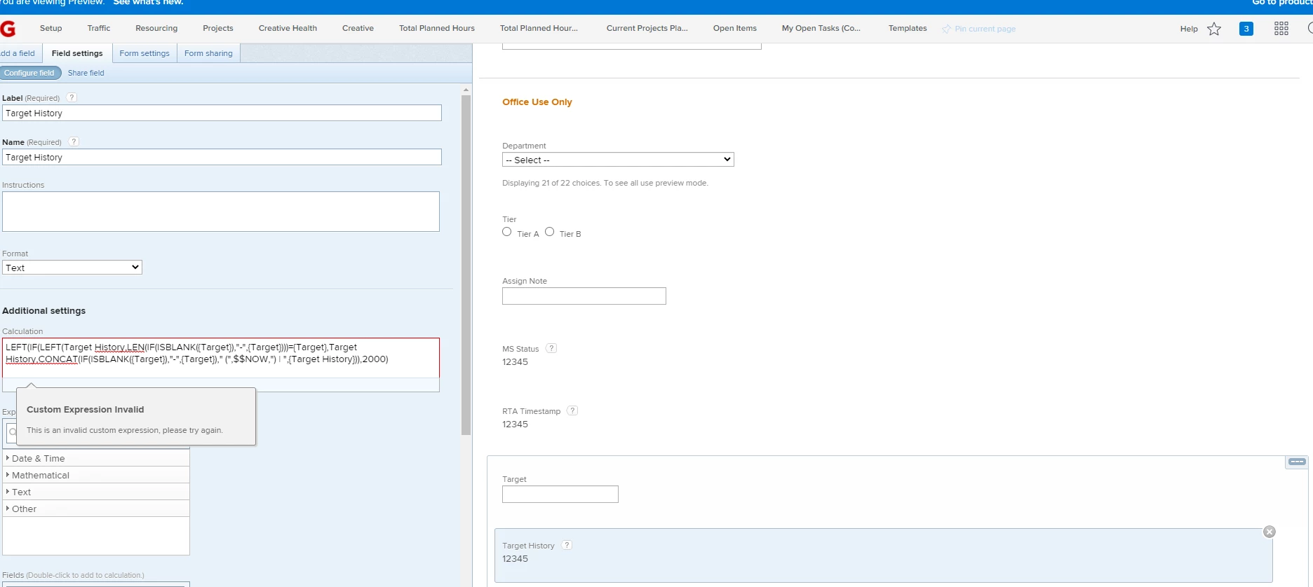 Trying to do this formula in my project report - but i'm getting confused on what I put in text mode, vs what I just create as a custom field. Thanks for clarification.