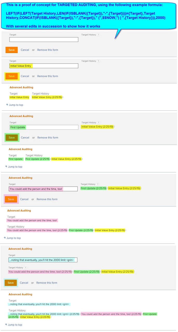 In my opening post above, the "Target" custom text parameter is the one that I am interesting monitoring for changes to it, and its "Target History" custom calculated parameter counter part contains the formula that will accumulate the history of the changes to the target as they are made.