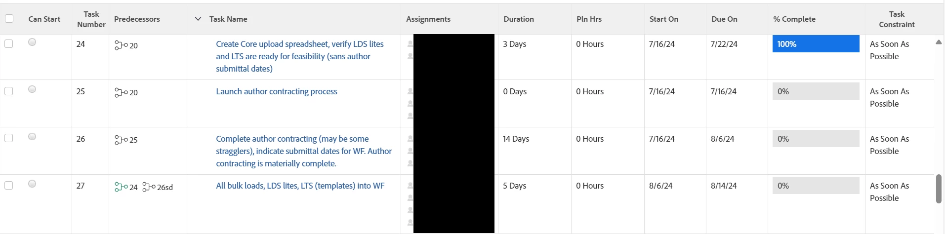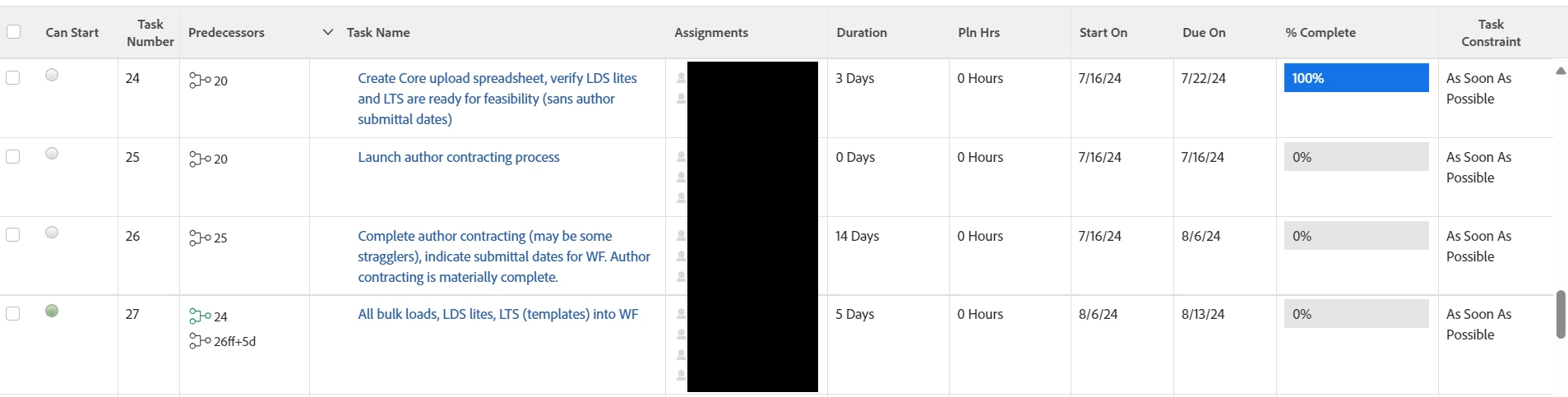 Scenario 1: use a Scheduled-Start dependency for the task 26 predecessor (this keeps the schedule dates the same, but task 27 does not get marked as Can Start when task 24 is completed):