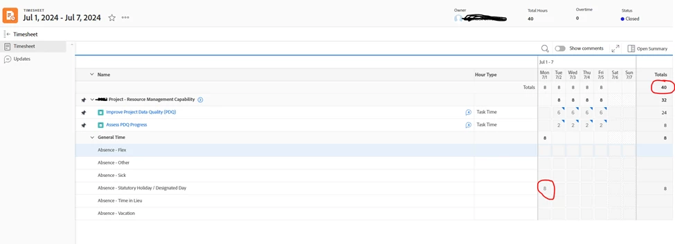 For example, on July 1, 8 hours was logged against ‘Absence - Statutory Holiday / Designated Day’. The total hours logged for that week was 40 hours as shown in screenshots below.