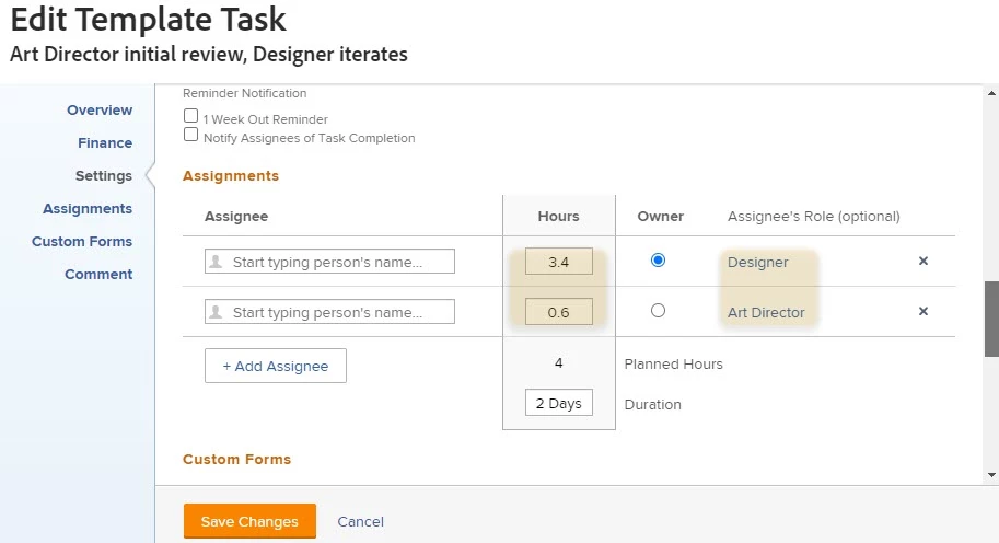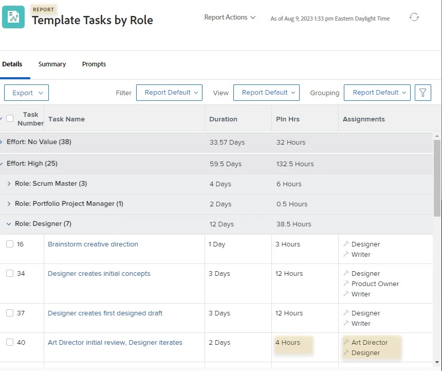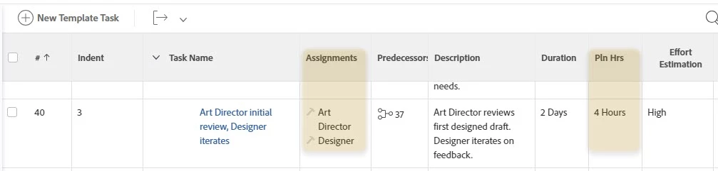 I've tried building a Template Tasks report but can't seem to get at the information I need. Part of my issue is that for most of my tasks where multiple roles are assigned (e.g. Writer and Designer), the Planned Hours are not split 50/50. It might be more like 85% Writer and 15% Designer (these hour ratios are all set within the Assignments section of a task within the template).