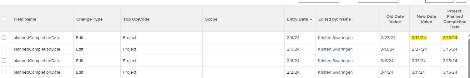 The closest thing I can get is to compare when the Planned Completion Date for the most recent journal entry record does not match the current Planned Completion Date for the project (see the screenshot for my sample project). However, I'm unsure how to limit the report to the most recent entry, and the report only identifies the discrepancy (not the source--specific user PTO, holiday, etc.).